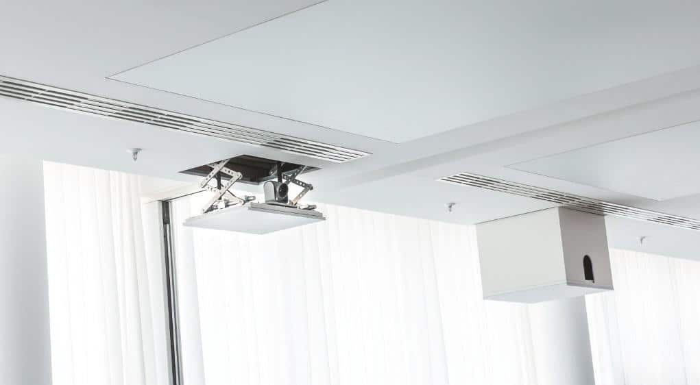 Projektoren lassen sich im Großen Konferenzsaal bei Bedarf aus der Decke ausfahren. Die Kamera des Polycom Videokonferenzsystems ist ebenfalls an einem Audipack-Deckenlift befestigt. (Bild: Jörg Küster)