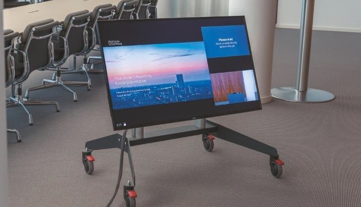 Eine raumübergreifende AV-Vernetzung ist am Bonner Standort von Flick Gocke Schaumburg aktuell nicht vorgesehen. Die gemeinsame Arbeit an Dokumenten ist jedoch über den UCC-Client („Unified Communications & Collaboration“) der Mitel Telefonanlage möglich. Und um die Buchung von Räumen inklusive der Bereitstellung des Caterings kümmert sich in der Bonner Zentrale ein eigenes Serviceteam. Die mit einer LED-Signalisierung (rot/grün) sowie einem berührungssensitiven Display versehenen elektronischen 7,4″-Türschilder von Nexxt Solutions PowerdSign greifen auf den Microsoft Exchange- Server zu.