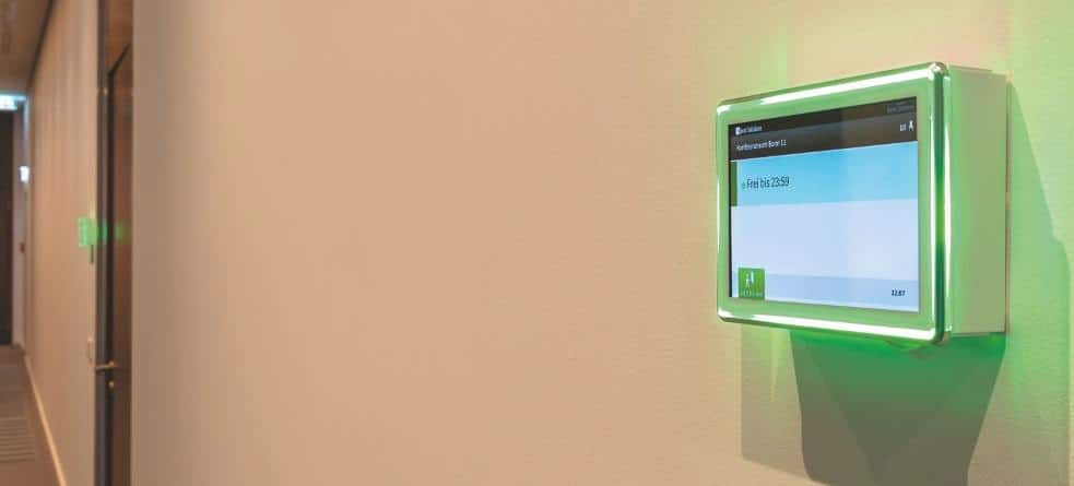 Mit LED-Signalisierung und einem berührungssensitiven Display versehene elektronischen 7,4“-Türschilder finden nahe der Türen Verwendung. (Bild: Jörg Küster)