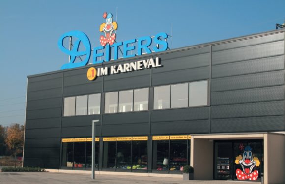„Kumm, loss mer fiere, nit lamentiere“, – der bei den Rheinländern allseits bekannte und beliebte Karnevalshit der Kölner Band „Höhner“ schallt den Kunden schon am Eingang des neuen Deiters Flaggschiffs entgegen und versetzt sie in Feierlaune. Getreu der Devise „Kumm, loss mer fiere“, was so viel bedeutet wie „Komm, lass uns feiern“, erwartet sie hier auf insgesamt 5.000 m2 Verkaufsfläche eine riesige Auswahl an Kostümen, Accessoires, Schminke und allem, was das Herz für den Karneval oder auch für Mottopartys wie beispielsweise Halloween oder Oktoberfest begehrt. Ganze 18.000 m2 umfasst das Grundstück im Gewerbegebiet von Frechen, das neben den Verkaufsräumen nicht nur an die 300 Parkplätze, sondern auch eine 3.000 m2 große Logistikfläche beherbergt. Von hier aus werden nun nicht nur die sieben weiteren Filialen im Rheinland beliefert, sondern auch der Onlinehandel betrieben.