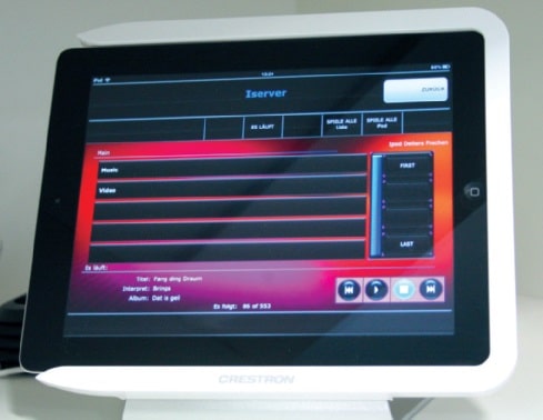 Als Audioserver dient dabei ein Crestron iServer, in dem ein Apple iPod sozusagen als Motor fest integriert ist. Dahinter hängen wiederum zentral eine digitale Tonmatrix von Yamaha sowie eine Crestron Mediensteuerung. Auf diese Weise lassen sich sämtliche Kanäle vom Chef- Büro aus steuern. Gleichzeitig haben die Mitarbeiter an der Information aber auch die Möglichkeit, per iPad auf die Musik zuzugreifen, beispielsweise die Lautstärke zu verändern oder einzelne Songs anzuwählen. „Das macht es für die Mitarbeiter einfacher und schöner und zudem haben wir die Möglichkeit, Playlisten zu erstellen, die bei Bedarf auch durch Werbung unterbrochen werden können, oder wir spielen ein Schlusslied, mit dem wir die Leute freundlich nach Hause bitten“, führt Herbert Geiss aus.