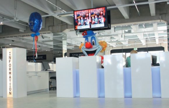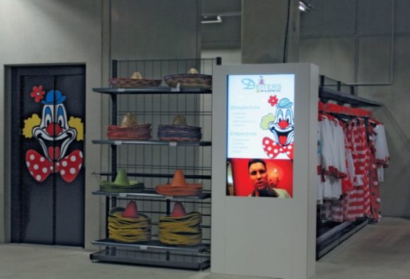 Wer schon einmal in der Vorkarnevalszeit im Rheinland in einem Karnevalsladen war, weiß aber auch, dass die Besucherströme enorme Ausmaße annehmen können, je näher die „jecken Tage“ rücken. Wartezeiten an den Kassen oder vor den Umkleiden lassen sich da kaum vermeiden – auch wenn Deiters sein neues Flaggschiff reichlich mit Umkleidekabinen bestückt hat. „Aus diesem Grund kommt hier neben der Musik zusätzlich ein Digital-Signage- System der Firma Onelan zum Einsatz – und zwar an verschiedenen Positionen und mit unterschiedlichen Screens“, erklärt Hempen.