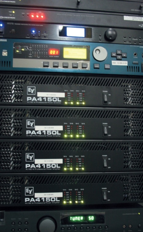 Die 360-Grad-Kameras von Mobotix liefern Bilder in Fischaugenoptik (Bild: Claudia Rothkamp)Insgesamt acht 4-Kanal-Endstufen von Electro-Voice übernehmen das Amping für die Zonenbeschallung (Bild: Claudia Rothkamp)