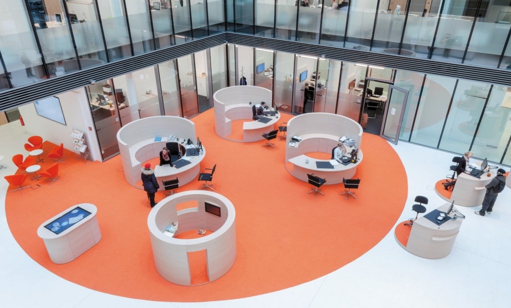 Das Glasdach über der atriumähnlichen Halle öffnet sich nach oben und weist damit auf die Kirche; auch die Büros und Meetingräume in den oberen Etagen sind nicht abgeschottet, sondern erlauben durch bodentiefe Fensterfassaden Einblicke von außen. Gleiches gilt für die innenliegenden Räume, die den Blick auf die 18 Meter hohe und von Tageslicht durchflutete Schalterhalle eröffnen.