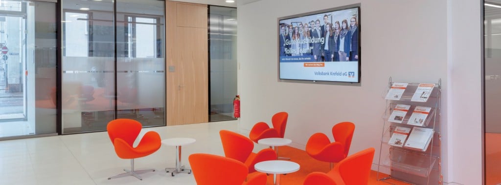 Und dafür sind in einem modernen Bankgebäude heutzutage verschiedene technische Komponenten erforderlich. Für die Entwicklung und Umsetzung des medientechnischen Konzepts war dabei das Leverkusener Unternehmen Tasteone Medientechnik zuständig – sowohl was das Digital Signage in den öffentlich zugänglichen Bereichen angeht als auch die internen Meeting- und Konferenzräume. So werden die Kunden schon beim Betreten der Volksbank Krefeld multimedial empfangen.
