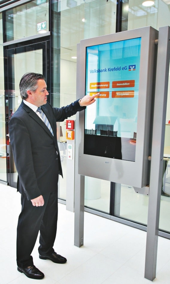 Gleich neben dem Eingang befindet sich ein echter Hingucker: eine mit einem transparenten Touchdisplay von LG bestückte Stele, deren Inhalte mit 3D-Anmutung präsentiert werden. Die dahinter liegende Signage-Software Display Star von komma,tec ruft hier verschiedene Versicherungsszenarien ins Leben. Zudem können sich Interessierte auf dem interaktiven Display über immobilienbezogene Kernthemen der Volksbank Krefeld informieren. Im Empfangsbereich der Kundenhalle weist ein 95″ Full HD LC-Display mit Edge LED-Hinterleuchtung von Samsung auf Veranstaltungen hin und zeigt zudem Börsennachrichten, den aktuellen Wetterbericht und anderes.