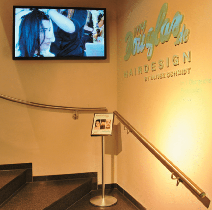 Bevorzugt an Rolltreppen oder Treppen befinden sich Digital-Signage-Systeme in Form von Kunden-Leitsystem-Monitoren, die den Weg zu den Abteilungen zeigen und entweder vollformatig mit den Leit-Informationen oder im Splitscreen mit dem Douglas-TV bespielt werden. Während das Kunden-Leitsystem eher dazu dient, die Kunden schnell zu ihrem gesuchten Bereich zu lotsen, hat der so genannte Kino-Bereich die Aufgabe, ein spezielles Unterhaltungsprogramm zu bieten. Hier stehen vier bequeme Kino-Sessel vor einer Beamer-Projektion und laden zum Pausieren ein, während auf der Leinwand Imagefilme, TV-Spots und andere Bewegtbilder laufen. Dieser Bereich eignet sich auch dazu, Begleitpersonen von Kunden zu unterhalten und mit parfümeriespezifischen Inhalten zu konfrontieren.