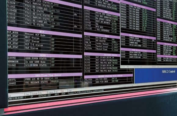 Im GEO MCC springen sofort drei Videowalls ins Auge, die sich aus jeweils zehn Bildschirmen in IPS-Technologie (LG 55LV77A) mit Diagonalen von 55 Zoll in einer 5×2-Anordnung (B×H) zusammensetzen. „Die Videowände dienen in erster Linie dazu, auf bestimmte Ereignisse aufmerksam zu machen – konkrete Aktionen werden dann mithilfe der auf den Arbeitstischen stehenden Bildschirme ausgelöst“, erklärt Jörg Schmittroth. „Bei besonderen Vorhaben wie beispielsweise Satellitenmanövern war es früher so, dass sich mehrere Ingenieure und Analysten Kopf an Kopf um den kleinen Computerbildschirm eines Operators drängten – heute funktioniert das dank der flexiblen Darstellungsmöglichkeiten der Videowände wesentlich entspannter. Bildsignale lassen sich zwischen den Videowänden frei hin und her schalten und je nach Lage sogar in anderen Räumen ausgeben.“