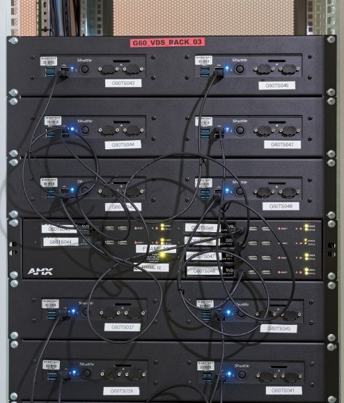 Die von den Shuttle PCs ausgegebenen HDMI-Signale werden AMX SVSI-Encodern zugeführt, die ihrerseits per Netzwerk mit leistungsstarken Nexus-Switches aus der 7000er- Serie von Cisco verbunden sind – die Switches sind untereinander per Glasfaser verkoppelt. Aus den Switches gelangen die Signale in den Kontrollraum, wo passende, in Einzelhalterungen platzierte SVSI-Decoder (Speisung über POE und als Backup über 12-V-Industrienetzteile) an den Rückseiten der Arbeitstische untergebracht sind – pro Tisch sind fünf Bildschirme, deren Lautsprecher, eine Tastatur und eine Maus angebunden.