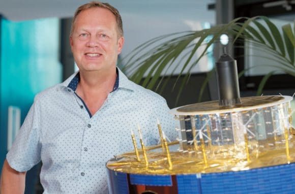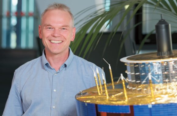 Am Satellitenmodell: Markus Schürmann, Inhaber der SWiCA Conference Technology e. K. aus Hirschberg an der Bergstraße. (Bild: Jörg Küster)