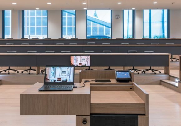 Zentrale Medientechnikkomponente in jedem Teacher Desk ist eine Extron DTP CrossPoint 4K IPCP Präsentationskreuzschiene, die als hochintegrierte Lösung unter anderem eine Kreuzschiene mit 4K-Ein- und -Ausgängen, einen Scaler, einen Audio-DSP, Verstärkermodule und einen Extron IP Link Pro-Steuerungsprozessor beinhaltet. „Ein Vorteil aus meiner Sicht ist die umfassende Funktionalität, die bei einem solchen Gerät gegeben ist“, sagt Planer Frank Sokat. „Wenn ich viele einzelne Komponenten verkabeln muss, erhöht sich das Fehlerpotenzial gegenüber einem All-in-One-Gerät, das sich zudem bereits am Markt bewährt hat und als kompakte Einheit funktioniert.“ Die Steuerung erfolgt in jedem Raum über ein Extron TLP Pro 720T 7″-Touchpanel, dessen Oberflächengestaltung auf Effizienz ausgelegt ist – ein Blick genügt, um sich zurechtzufinden. „Ziel der Programmierung war, dass sich Dozenten mit den Inhalten ihrer Vorlesung befassen und keinen Gedanken auf die Bedienung der Medientechnik verwenden müssen“, sagt Dieter Wagner.