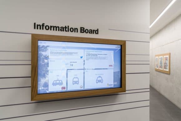 Das Welcome Board ist als interaktives Touch-Display ausgeführt und dient als digitales schwarzes Brett zur selbstbestimmten Informationsvermittlung für Mitarbeiter und Besucher. Eine Sprachumschaltung der Medienexponate soll die internationale Ausrichtung des Unternehmens unterstreichen. Als zentrale Informationsplattform bietet das Display nicht nur Informationen, sondern ermöglicht auch den Taxi-Ruf und informiert über Bus- und Zugverbindungen.