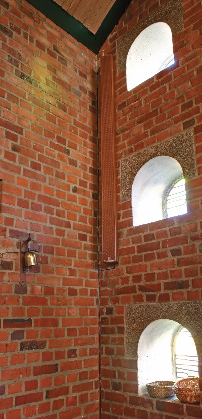 Leicht horizontal geschwenkt an der Wand montiert heben sich die schlanken Lautsprechersäulen bei flüchtiger Betrachtung kaum vom Backsteinhintergrund ab: „Ein Vorteil des neuen RCF-Systems ist, dass es optisch kaum auffällt, was in Kirchen meistens gewünscht ist und Architekten glücklich macht“, sagt Paul Klein mit einem Schmunzeln. Eine geeignete Farbgebung für die Lautsprechergehäuse wurde in Siegburg mithilfe einer RAL-Karte ermittelt und durch die Firma Franken umgesetzt.