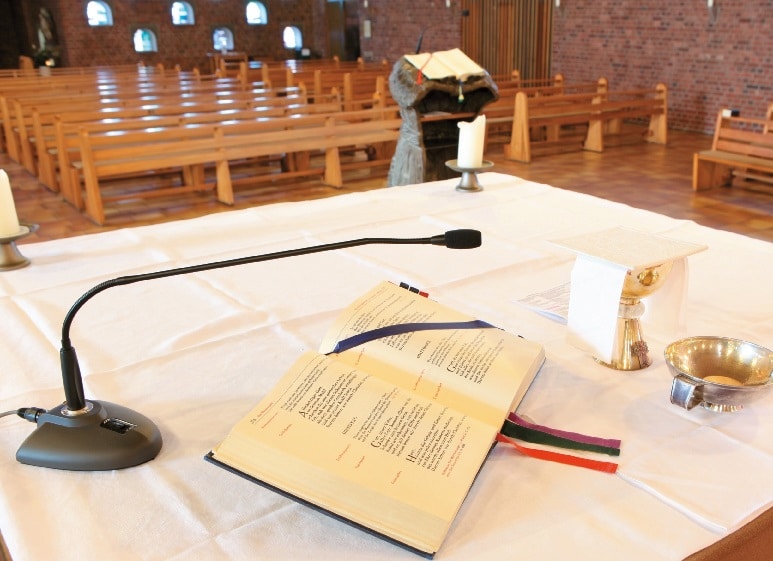 Schwanenhalsmikro auf dem Altar; im Hintergrund der ebenfalls mit einem Gooseneck ausgestattete Ambo (Bild: Jörg Küster)