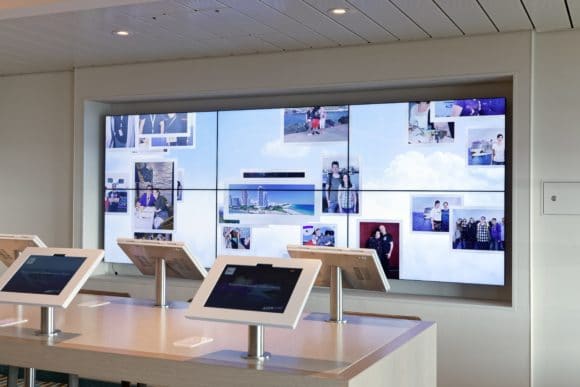 Der Hamburger System-Integrator Amptown System Company (ASC) hat in der Kunstgalerie interaktive Bild- und Videotechnik installiert, die neben der Information auch Features zur Unterhaltung der Kreuzfahrtgäste bietet. So hat ASC in der auf Deck 6 befindlichen Galerie eine interaktive Splitscreen-Bildwand installiert, die aus 6 x 2 LC-Displays des Herstellers Planar zusammengesetzt ist. Die Touch-Funktionalität ist in den die Screens umgebenden Custom-Rahmen versteckt und ermöglicht im Zusammenspiel mit der Signage-Software eine Bedienung der gesamten Bildwand wie bei einem Smartphone. Die Wand wird tagsüber mit Inhalten unterschiedlicher Themen bespielt, darunter Schnappschüsse und stimmungsvolle Bilder der Bord-Fotografen. Im Hintergrund arbeiten die für die Bildwand zuständigen Server. Sie können direkt auf die an Bord implementierte Foto-Datenbank zugreifen, aus der nach dem Zufallsprinzip Bilder für die Anzeige ausgewählt und arrangiert werden. Darüber hinaus werden die zum Kauf angebotenen Kunstwerke digital dargestellt. Die Projektverantwortlichen bei ASC haben darauf geachtet, dass die Anzeige unter sämtlichen Lichtverhältnissen gut einsehbar ist – so dass auch das von zwei Seiten einfallende Tageslicht an sonnigen Tagen keine Probleme macht.