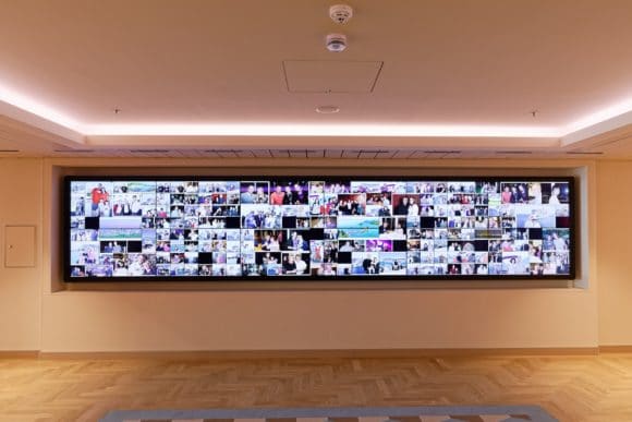 Die Bildschirmausstattung in der Kunstgalerie ist außerdem durch drei kleinere Splitscreen-Bildwände komplettiert: Eine Wall aus 3 x 2 Planar Screens ohne Touch-Funktionalität im „Fotoshop“ an Board wird ausschließlich zur automatischen Wiedergabe von Bildinhalten herangezogen. Eine in gleicher Weise aufgebaute Anzeigefläche ist auf der gegenüberliegenden Seite des Raums installiert. Ergänzend dazu befindet sich hinter einem Counter eine 2 x 1-Bildwand.