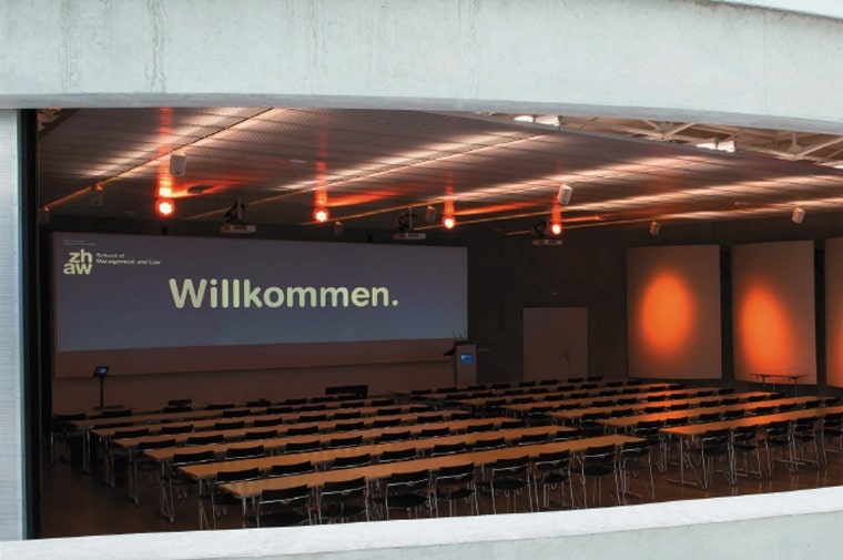 Im schweizerischen Winterthur begeistert ein ansprechendes Lernumfeld die Studentinnen und Studenten der School of Management and Law. Das optische Highlight der Hochschule ist die Aula E11, die mit zeitgemäßer Medientechnik wie Laserprojektion aufgerüstet wurde.
