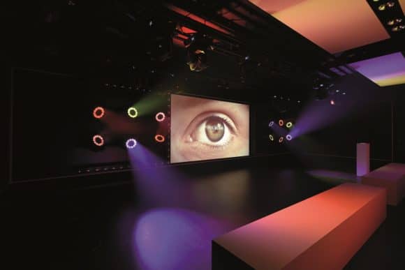 Weitere Anschlüsse befinden sich im Videowand-Möbel und in vier Bodentanks. Die Signalübertragung läuft über HD-Base T und Dante. Neben dem Audio-Prozessor ist als Zentrale eine AV-Matrix installiert. Im separaten Technikraum ist die Mediensteuerung mit allen Zuspielern, Audiosystemen sowie ein Anschlussfeld untergebracht. Zur Steuerung gehört auch die Funktion für das Ein- und Ausschalten der gesamten World of Light und eine Zeitautomatik, die nach Bedarf deaktiviert werden kann.