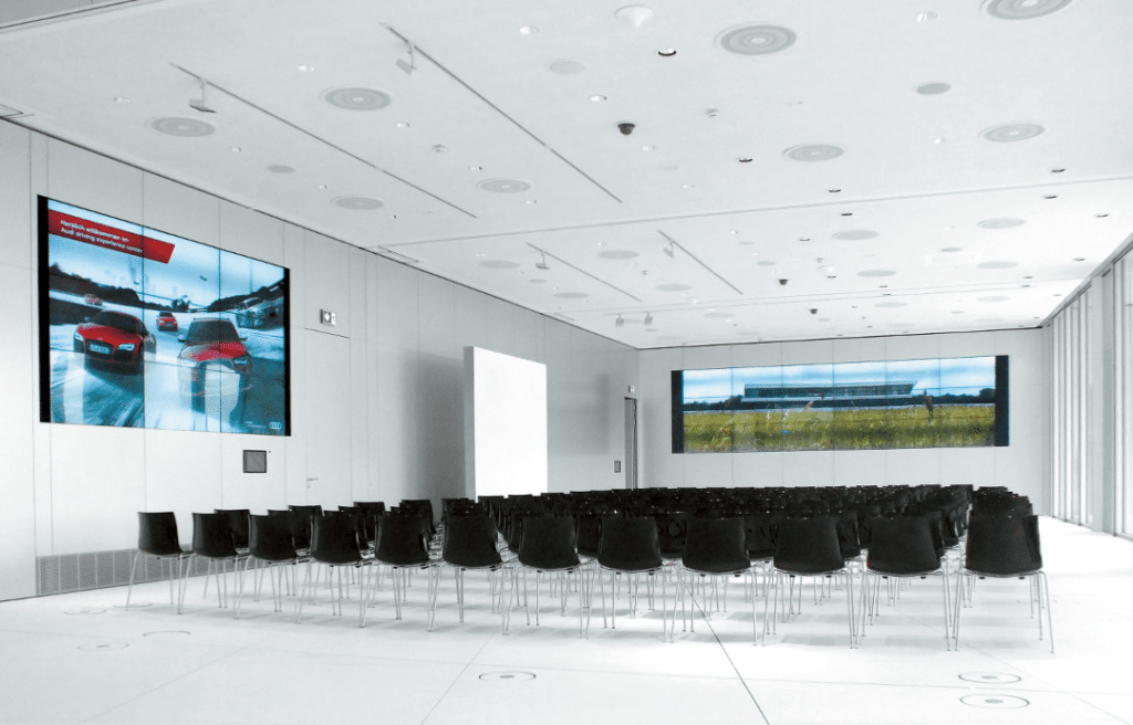 Komplett geöffneter Konferenzbereich mit zwei Monitorwänden (Quelle: Audi)