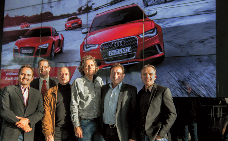 Das Projekt-Team: Sascha Jilko & Wolfgang Vogt (Audi), Hans-Peter Hofmann & Achim Hannemann (hp+Plan), Michael Krämer & Jörg Alberti (BFE) vor der Monitorwand bei voller Sonneneinstrahlung von der Seite