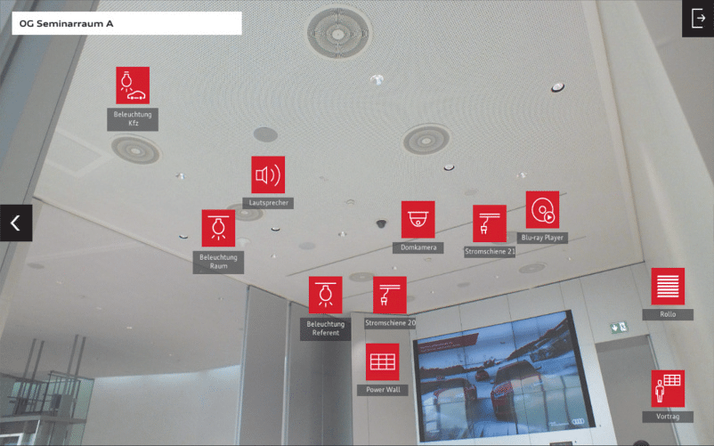 Screenshot der Raumsteuerung – beschriftete Icons sind genau an der Stelle des Fotos platziert, an dem das entsprechend zu schaltende Objekt liegt (Quelle: Audi)
