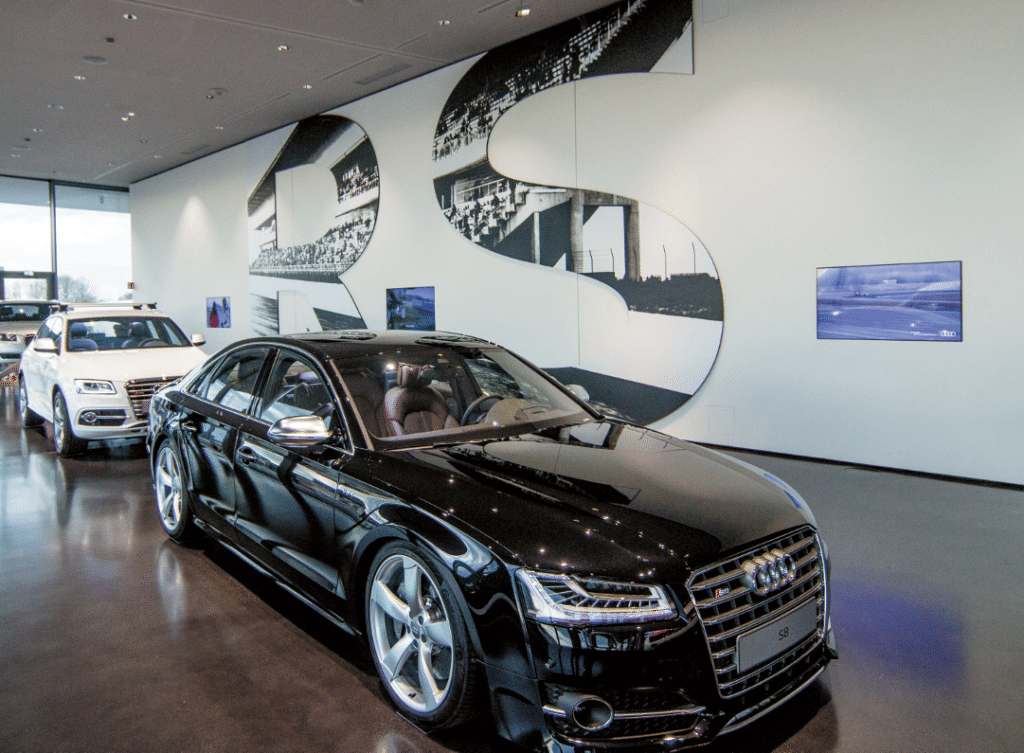 Beim Betreten des Gebäudes begrüßt die Gäste eine 4,80 × 2,80 m große Monitorwand mit 16 steglosen Full-HD 55″-Monitoren, die mit der eigens produzierten Digital-Signage-Software „AMMS (Audi Multi Media System) Octopus“ in 3D bespielt wird. Die Filme werden standardmäßig in 4K wiedergegeben. Schrift-Einblendungen werden in einem gesonderten Layer mit 8K-Auflösung über die 4K-Filme gelegt, um die optimale Schärfe zu erzielen. Dabei wird jeder Monitor gesondert in Full-HD angesteuert. Hier kommt also nicht die herkömmliche Split-Screen-Technologie zum Einsatz, sondern das Bild wird aus 16 in Full-HD angesteuerten Monitoren zu einem im Vergleich viel höherwertigen Gesamtbild zusammengerechnet.