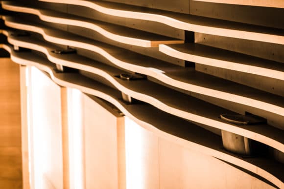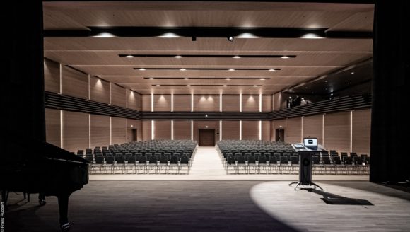 Der Saal misst rund 22 × 18 Meter ohne den Bühnenbereich. Wände und Decke sind komplett mit Holz verkleidet – durch Beleuchtungsscharten mit aufgebrochener Struktur. Guido Kacher erläutert: „Die geschuppte, kaskadierte Fläche bricht Reflexionspfade auf, es ist keine parallele Wand vorhanden. Gleichzeitig dient sie dazu, Licht diffus in den Raum zu bringen. Der Architekt hatte den Anspruch, viel zu verstecken, und den Raum gleichzeitig plastisch zu gestalten – was durch jede illuminierte Kante unterstützt wird.“