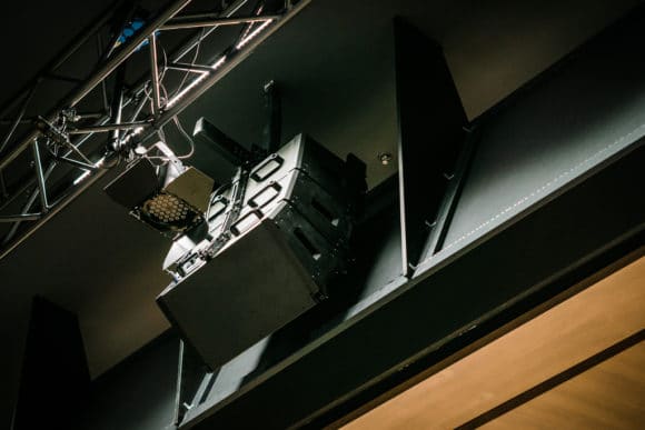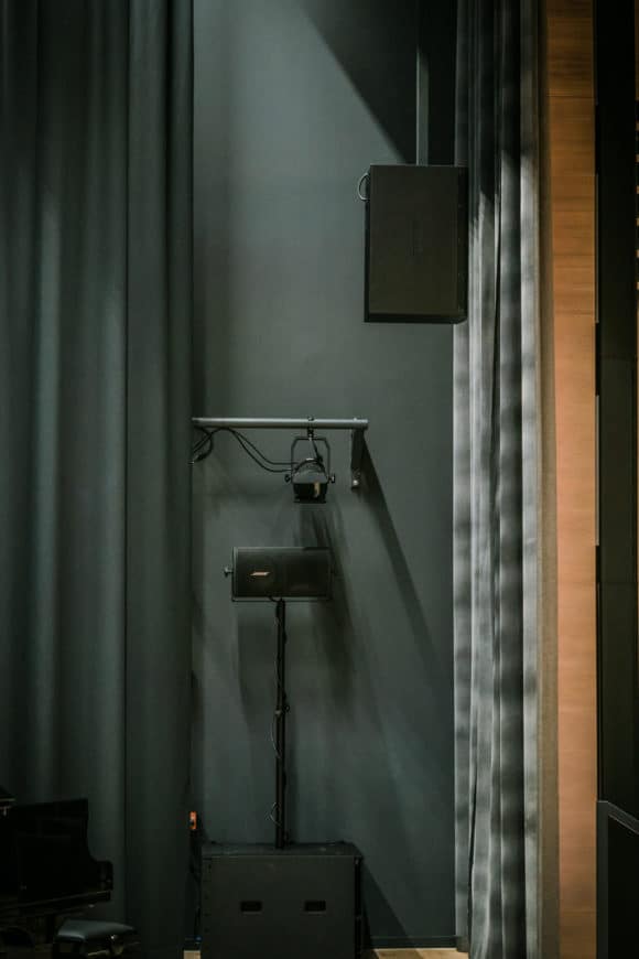 Dazu kommen zwei „große“ Bose Subwoofer ShowMatch SMS118, die ohne Flugmechanik verbaut sind, um nicht zu technisch zu wirken. Guido Kacher: „Sie beginnen bei 30 Hertz und sind nur im Cinema-Modus aktiv, damit sie bei Bühnenveranstaltungen keinen Streuschall auf die Bühne abgegeben. Sie sind mit der Wand verschraubt, damit sie nicht verschoben werden können und dienen als mechanischer Fixpunkt für die Bühnenmonitore, die dort als Sidefills per Distanzrohr montiert sind.