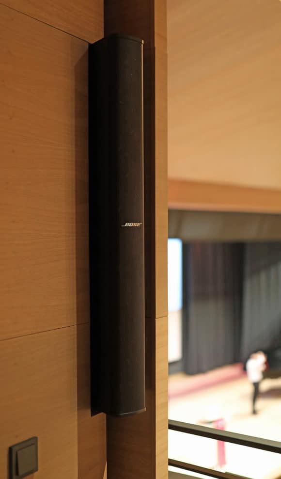 Das Bose-System vermittle Sprache auch im halligen Raum sauber, sei daher die erste Wahl gewesen. Aktives Beam-Steering, mit Split-Beam über die gesamte Länge von 3 Metern sorge für den hohen „Gleichlauf“ im Saal, verbessere die Sprachverständlichkeit und optimiere den Raumeindruck. Auf ein klassisches Line-Array-System verzichteten sie, um die Lautsprecher optisch unauffällig zu halten – eine der Vorgaben des Bauherrn.