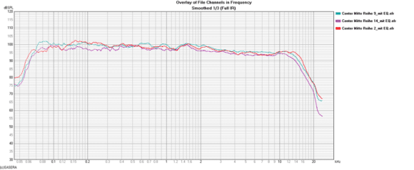 Terz geglätteter Amplitudenfrequenzgang des Center-Arrays, von der vorderen bis hinteren Reihe mit maximal +/- 1,5 dB (Bild: Soni.eK)