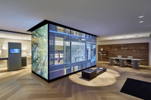 Blickfang ist dabei die über 20 qm große, von der a/c/t Beratungs & System GmbH ausgestattete Digital Signage Videowall. 24 „steglose“ 55-Zoll Displays von Samsung präsentieren die Markenwelt von Occhio und aktuelle Projekte zum Thema Lichtkultur. Die größere Wandfläche, die zum Haupteingang zeigt, verfügt über 4×4 horizontal montierte Displays, während die schmalere Seite in Richtung Nebeneingang mit 2×4 ,ebenfalls horizontal angeordneten Displays ausgestattet ist. Dabei laufen die Bildinhalte über die gesamte Videowall. Sie werden von drei synchronisierten ProGrafic-Player PCs ausgespielt, die jeweils über 12 Grafikkarten-Ausgänge mit einer Auflösung von 1920×1080 Pixel pro Ausgang verfügen. Das Gesamtbild hat eine Auflösung von 4.320 auf 11.520 Pixel. Die Ausspielung, Synchronisation und Planung der speziell für diese Anwendung erstellten Inhalte erfolgt über die Digital Signage-Software easescreen.