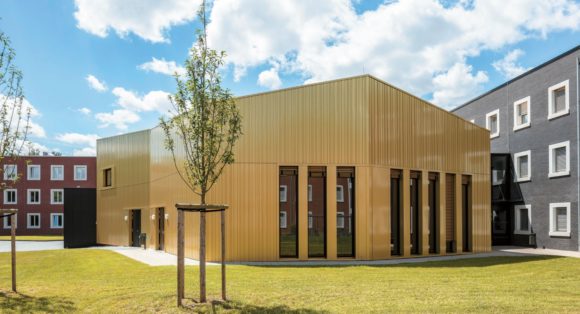 Im Auftrag des Bau-und Liegenschaftsbetriebs NRW haben hks architekten aus Aachen den neuen Musik-Campus für das Ausbildungsmusikkorps der Bundeswehr auf dem Gelände der Waldkaserne in Hilden errichtet. Der Campus umfasst ein Ausbildungsgebäude mit Orchestersälen, Proberäume und ein Unterkunftsgebäude. Bis zu 140 angehende Orchestermusiker werden hier zentral ausgebildet.