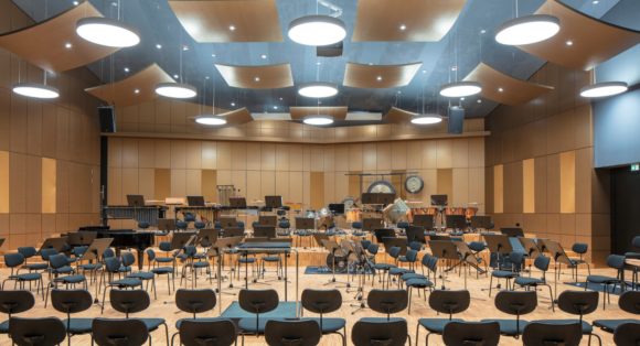 Diese Oberflächen sind schallschluckend ausgelegt und machen etwa 40 Prozent der gesamten Raumoberfläche aus. Der Rest der Wand- und Deckenflächen reflektiert den Schall. Dominik Schenke führt weiter aus: „Durch den Wechsel zwischen schallabsorbierenden und reflektierenden Flächen wird eine gleichmäßige Schallverteilung im Raum erreicht, welche durch den Einsatz von Diffusoren noch optimiert wird. Das gegenseitige Hören der Musiker untereinander wurde durch insgesamt 15 gebogene Deckensegel unterstützt.