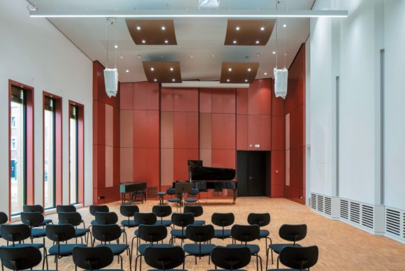Zunächst haben Graner + Partner die Architekten zur Grundrissgestaltung und zur Festlegung der erforderlichen Raumgröße beraten. „Das sind wichtige Voraussetzungen, um anschließend mit der Auslegung der Oberflächen optimale akustische Bedingungen für die jeweilige Nutzung zu erreichen“, erläutert Dominik Schenke. So umfassen die raumakustischen Maßnahmen der Probesäle Teilflächen an der Decke, die mit Gipskarton-Lochplatten ausgeführt wurden. An den Wänden kommen mikroperforierte Holzpaneele zum Einsatz.