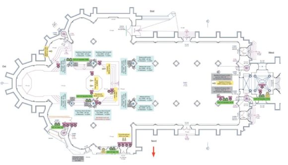 ABB. 01: Grundriss der Basilika mit den sechs Lautsprecherpositionen (hellblau) an den Säulen der Vierung sowie allen analogen Einspeisepunkten und Netzwerkanschlüssen (Bild: Anselm Goertz)