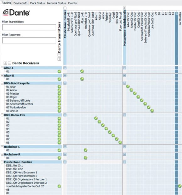 ABB. 02: Ein kleiner Ausschnitt der Dante Matrix, die in der jetzigen Ausbaustufe alle Quellen und Empfänger der Basilika und Beichtkapelle zusammenführt. (Bild: Anselm Goertz)