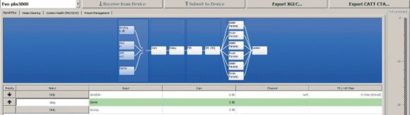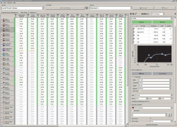 Die Grundfunktion des Mastertone ist die eines Automatik-Mischers. Alle Eingänge können über eine alles umfassende Matrix (ABB. 06) mit allen Ausgängen beliebig kombiniert werden. Für jeden Eingang und jeden Ausgang stehen je fünf parametrische EQs, ein Compressor (nur in den Eingängen) sowie Gain- und Delay-Einstellungen zur Verfügung. Die Eingänge können in acht Gruppen für die Funktion des Automatik-Mischers zusammengefasst werden. ABB. 06 zeigt einige der Funktionen in der Mastertone-Software.