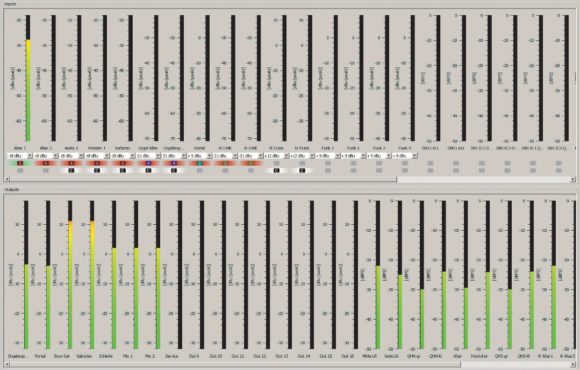 ABB. 07: Pegelübersicht für alle Ein- und Ausgänge des Mastertone Mixers. Aktive Compressoren und Automixer- Funktionen werden hier ebenfalls übersichtlich angezeigt. (Bild: Anselm Goertz)