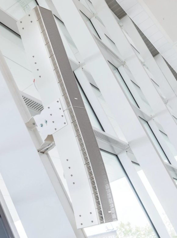 Die aus der Simulation resultierenden Empfehlungen wurden bei der Montage im Foyer ohne nennenswerte Modifikationen übernommen. Unerwartete „Überraschungen“ gab es nicht, und auch von den Verantwortlichen kam im Gegensatz zu manch anderem Projekt kein Widerspruch gegen die sichtbare Anbringung der Lautsprecher.