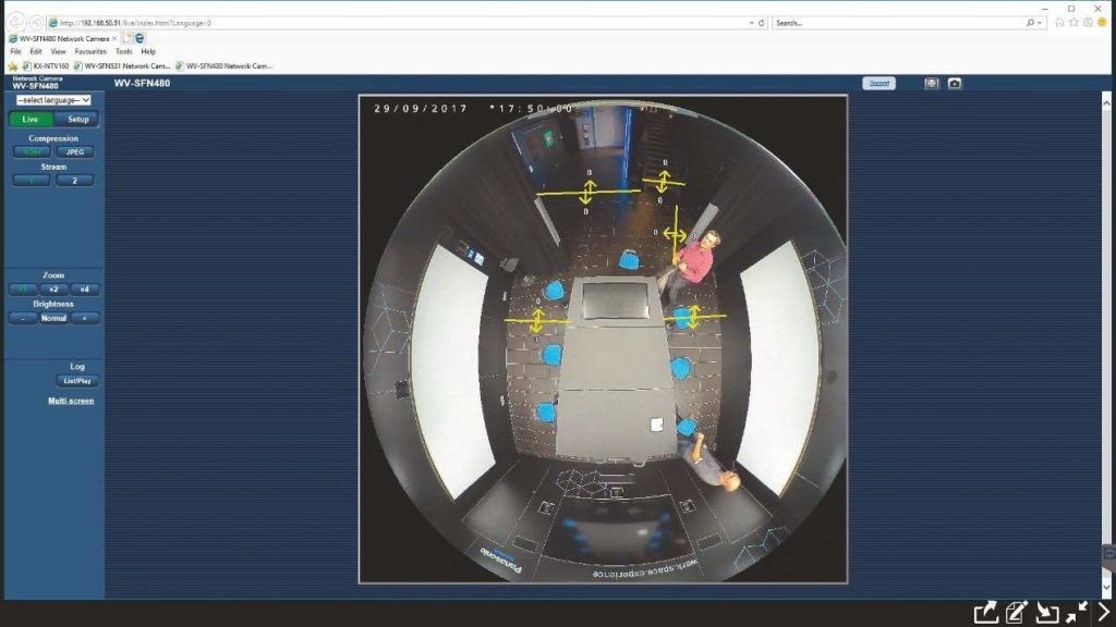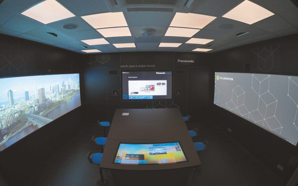 Eine unter der Decke verbaute 360°-Überwachungskamera vom Typ WV-SFN480 zeigt den Raum und das Geschehen aus der Vogelperspektive und zählt zusätzlich noch den Bewegungstraffic, mit dessen Daten zahlreiche Analysen möglich sind. Sogar die in der Decke eingebaute Panasonic-Klimaanlage zählt die Personen im Raum, um ihre Temperatur darauf zu justieren. „Eine besondere Herausforderung war es, bei der Planung alle Erfordernisse der Einzelgeräte unter einen Hut zu bekommen“, beschreibt Marco Schulz seine Planungs- und Projektierungsarbeit. „Die Kameras wollen auf einen bevorzugten Platz und auch die Displays, Mikros, Lautsprecher, Beleuchtung, Klimaanlage und die Projektoren hatten fixe Einbauplätze abhängig von Optikparametern und Bildgröße. Außerdem mussten beim Deckeneinbau Wärmeentwicklung und Lautstärke berücksichtigt werden – und das alles bei den engen baulichen Gegebenheiten.“