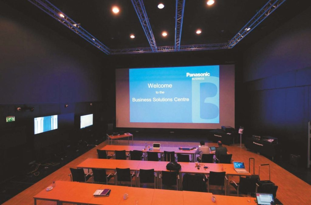Für Ausstellungen, Schulungen, Pressekonferenzen, Tagungen, Tests und Shoot Outs ist der große Veranstaltungssaal konzipiert. Ausgestattet ist er mit dem 3DLP Chip Solid Shine Projektor PT-RZ 12K, der Bilder mit 12.000 Lumen auf eine 10 m × 5 m große Leinwand projiziert. Per Crestron Touch-Displays (8,9″ und 7″) lassen sich vielfältige Zuspielmöglichkeiten an der Crestron DM-MD32x32 Kreuzschiene auswählen, unterstützt von 5-Kanal Sound.
