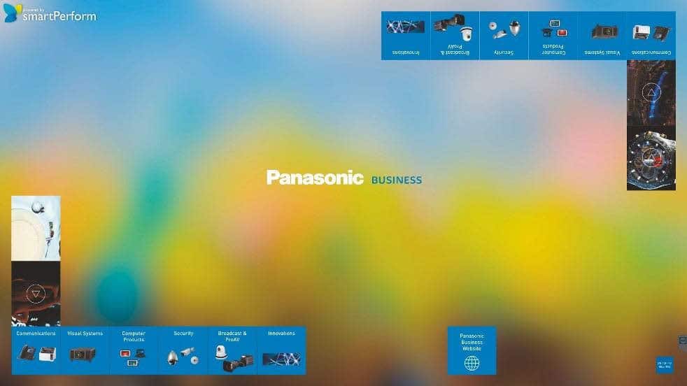 Eingangsseitig in den Tisch eingebaut ist das TH-42-LF80-Display mit kapazitivem Touchrahmen – es dient gleichzeitig als Remote- und Quellenauswahl/Präsentationspanel. Panasonic hat hier die Software Smartperform von immersion7 gewählt, die verschiedene Medien auf einer interaktiven Fläche zusammenbringt. Die Contentpflege erfolgt per Drag & Drop und „What You See Is What You Get“ (WYSIWYG) oder später im Betrieb ad hoc über automatisierte Prozesse mit Zugriff auf synchronisierte Verzeichnisse. So können Präsentationen schnell und unkompliziert erstellt und gepflegt werden. „Inhalte können schnell geändert werden, die Verlinkung jedoch bleibt“ kommentiert Marco Schulz.