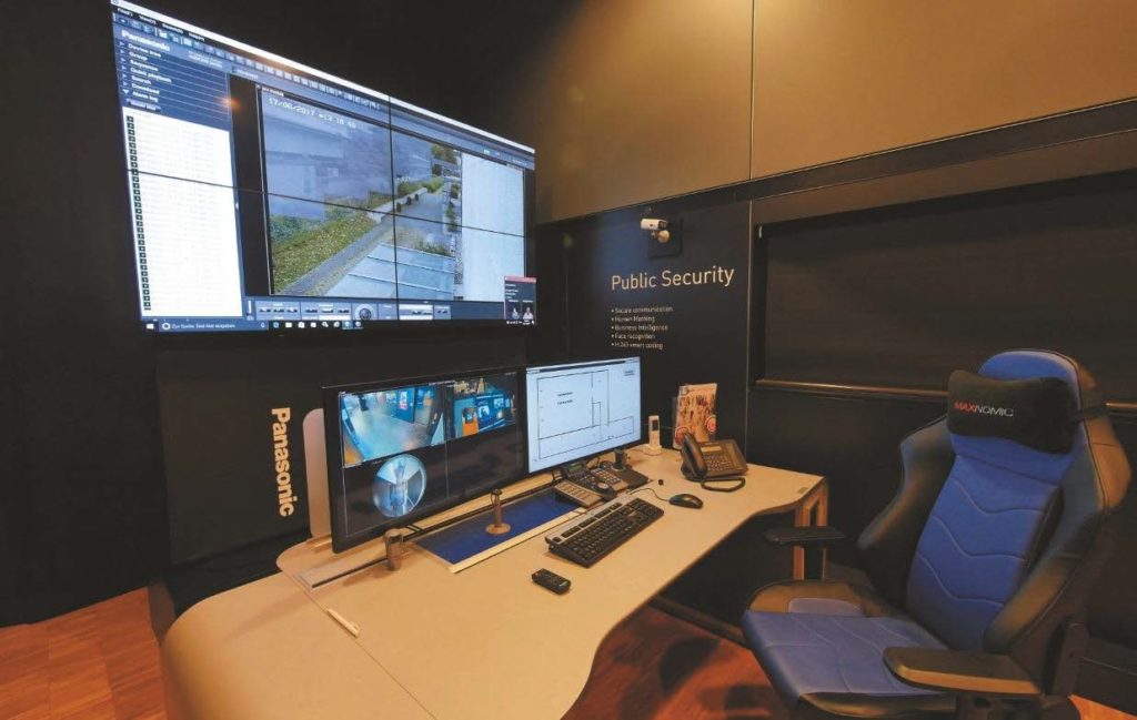 Im Zwischengeschoss befindet sich das Public Security Kontrollcenter. Auf 16 unterschiedliche Kameras im Außen- oder Innenbereich kann der Bediener über die Benutzeroberfläche der Panasonic-Client-Management-Software ASM300 gleichzeitig zugreifen und auf der mit 4 × 47″ bestückten Splittwand vom Typ 47LFV 5 das IP-Überwachungssystem visualisieren. Das System erfasst Gesichter in Echtzeit und gleicht sie mit dem Datenbestand auf dem Server ab. Es benachrichtigt automatisch, wenn ein unerwünschter Besucher identifiziert wurde. Anwendungsbereiche sind neben öffentlichen Gebäuden auch Flughäfen – so können nicht nur Personen orts- und zeitgenau überwacht werden, sondern auch Gepäckstücke. Ist bei Überwachungsaufgaben der Schutz der Privatsphäre einzuhalten, kommt das People Masking System zum Einsatz, das im BSC z. B. beim Schwenken der Außenkameras auf das Nachbargebäude verwendet wird. Schließlich darf in Nachbars Garten nicht spioniert werden.