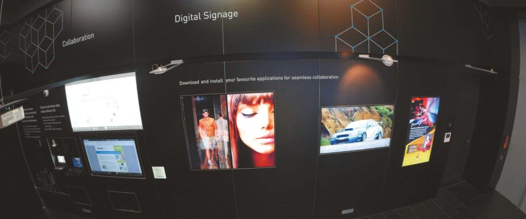 Im Digital-Signage-Bereich mit dem virtuellen LED-Himmel sind die hauseigenen Digital- Signage-Displays mit System on Chip installiert. Jedoch ist hier der Focus des BSC nicht nur auf die reine Bildqualität gelegt, sondern auf Mehrwertlösungen für Kunden und Agenturen. So kann der Besucher selbst live die Link Ray-Technik ausprobieren. Diese nutzt LED-Licht, um Daten auf mobile Endgeräte zu übertragen. Das modulierte Licht kann entweder von einer Wandbeleuchtung oder von der Backlight-Beleuchtung eines Digital-Signage- Displays kommen. Eingescannt empfängt dann das Smartphone Zusatzinfos des Produktes oder Ausstellungsstücks, ebenso könnte der Interessent auch gleich einen Bestellvorgang auslösen.