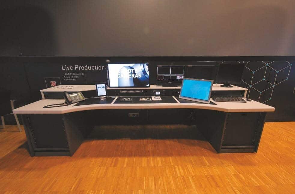 Mit Hilfe der vier installierten AW-UE70 Schwenk-Neige-4K-Kameras mit Face Tracking kann sich der Teilnehmer frei im Raum bewegen und ist trotzdem immer gut im Bild – dank des Shure 360°-Deckenmikrofonarrays MXA910 gilt das auch für Audio. Die Audiosignale sitzender Teilnehmer werden in einem Bereich von 9 m Durchmesser erfasst. Weiterhin wird der Raum audiomäßig unterstützt durch Bose-Deckenlautsprecher DS 40.