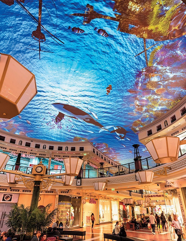 “Hinzu kam, dass LEDs damals noch viel zu schwer waren, um sie an der Decke befestigen zu können. Zum 10. Geburtstag des Einkaufszentrums im März 2016 ist aber eine technisch völlig neue und deutlich verbesserte Version des Panoramahimmels an den Start gegangen, die den Besuchern sozusagen ein Unterwasser-Shopping-Erlebnis bietet. Den Eintrag ins Guinness Buch der Rekorde als größte zusammenhängende Projektionsfläche der Welt hat die 1.200 m2 große Deckenprojektion zwar nicht geschafft, dennoch ist sie in Größe und Umfang einzigartig.