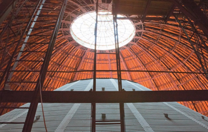 Von der Höhe her scheint – wenn man im Inneren steht – die Kuppel bei ca. 20 Metern über dem Mittelpunkt des Parketts zu enden. Mitnichten, denn hinter der gefächerten, halboffenen Konstruktion aus Spanplatte geht es weiter: Zunächst folgt eine Zwischenkuppel, mit Leitern in schwindelnder Höhe besteigbar, und dann erst die eigentliche Außenkuppel. „Wir haben eine maximale Höhe von 52 Metern“, erläuterte Randolf Hormann. „Es sind ungefähr zwölf Meter zwischen den Kuppeln und dann noch mal 20 Meter bis zur Außenkuppel.“