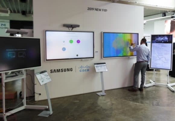 Nach dem großen Verkaufserfolg des digitalen Flipcharts WM55H war es nur eine Frage der Zeit, bis der großen Bruder WM65R auf den Markt kommt. Mit dem Ziel, weitere Anwendergruppen zu erschließen, ist das Collaboration Board ab September zu einem attraktiven Preis lieferbar; entsprechend groß war das Interesse der anwesenden Händler und Systemintegratoren. Integriert im 220 nit hellen interaktiven UHD-65″-Whiteboard ist das Betriebssystem Tizen 5.0. Das 1.522×869×63 mm große und 40 kg schwere Display lässt sich wie ein Tablet im Landscape- oder Portraitformat betreiben. Für eine flexible Handhabung haben einige Zubehör-Anbieter bereits stabile Rollständer mit 90°-Drehmöglichkeit des Flips entwickelt.