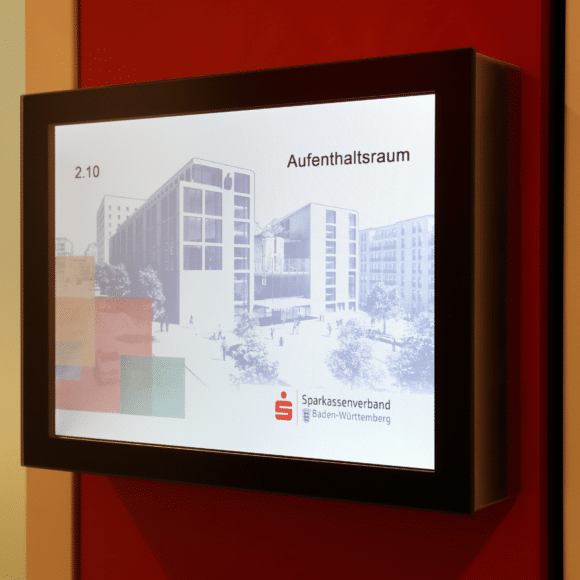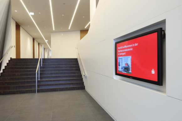 Alle Räume des Hauses sind mit elektronischen Türschildern (MOStron 10,4“-Aufputzdisplays) ausgestattet. Digital-Signage-Lösung der Wahl ist easescreen Pichler Medientechnik; zum Einsatz kommt ein Management-Server plus E-Sign-Server für die elektronischen Türschilder plus 4 x Player Gold. Die im von der Sparkassenakademie gewünschten Design gestalteten Anzeigen werden automatisch aktualisiert. Das Team der promedia GmbH hat dazu eine Schnittstelle zwischen easescreen und ecadia eingerichtet.