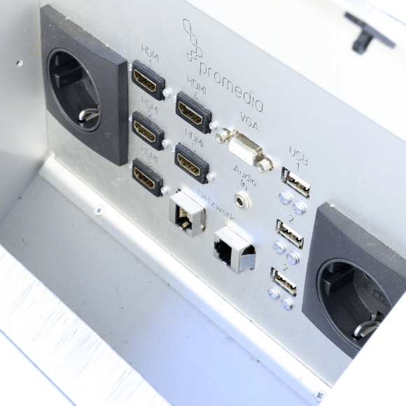 Vortragende reichen ihre Unterlagen im Vorfeld auf elektronischem Weg bei der Sparkassenakademie ein. Die digitalen Inhalte werden von der hausinternen Qualitätssicherung geprüft und passend zu den vor Ort vorhandenen Gegebenheiten in ecadia eingespielt. Am Veranstaltungstag werden die Daten automatisch auf einen Server übertragen, auf den der im Referentenpult des gebuchten Raums untergebrachte Rechner ebenfalls automatisch zugreift. Dadurch wird sichergestellt, dass die Unterlagen immer zur richtigen Zeit am richtigen Ort verfügbar sind. Auch ein kurzfristiger Raumwechsel in ecadia ist hierbei jederzeit möglich – die Daten wandern mit. Das Mitführen eines Laptops ist für Vortragende somit nicht zwingend erforderlich. Falls mitgebrachte Hardware dennoch angeschlossen werden soll, stehen in Tischanschlussmodulen (TLS TAM 305 Standard III mit promedia-Branding) geeignete Anschlüsse (HDMI, VGA etc.) zur Verfügung. Für die Zukunft wird in Stuttgart darüber nachgedacht, regelmäßig im Haus tätigen Referenten einen direkten Online-Zugang zu ecadia zu gewähren, um die Abläufe noch effizienter zu gestalten.